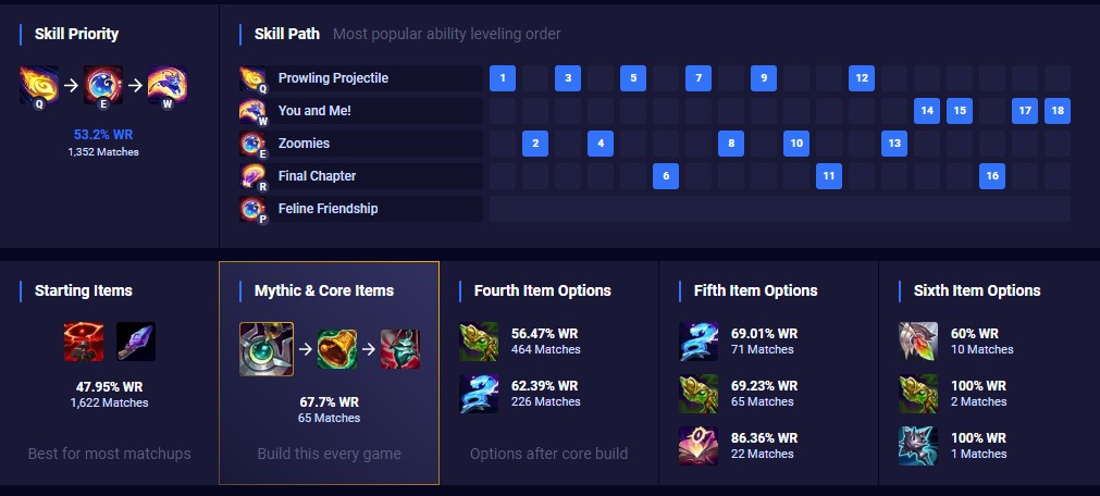 Her Q, Prowling Projectile, is a skill shot that can damage and slow enemies when she is attached. Her W, You and Me! It is a dash that can connect to Jinx and give her a bonus adaptive force based on Yuumi’s AP. Her E, Zoomies, is a heal that can restore Jinx’s health and give her bonus movement speed. Her R, Final Chapter, is an ultimate that can fire seven waves of magic damage and root enemies hit by three waves.
