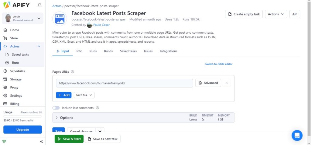 Step 5: When on your Apify Console, a task will be created. This means you can start specifying how you want to scrape data from Facebook.